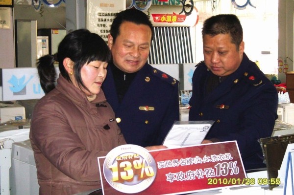 近期,我市工商部门开展严厉打击危害消费安全违法行为,严查制售假冒伪劣商品。图为环潭分局执法人员在超市抽查“下乡”家电。 (罗继 朱玲摄)