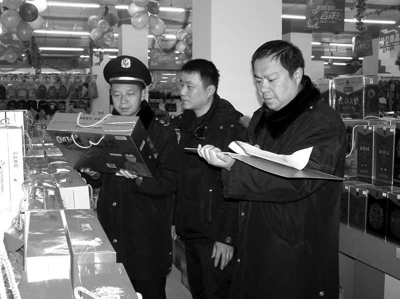 近日,广水市余店工商分局开展了严厉打击危害消费安全违法行为活动,以保证春节消费市场安全。图为执法人员正在超市抽查商品。
