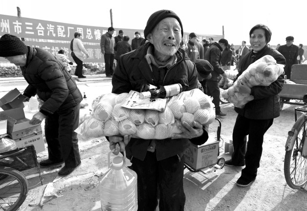 一月二十九日,曾都经济开发区龚家棚村村民储玉山领到了周晓波为老人们准备的水果、食用油等年货,十分高兴。周晓波是随州钱庄担保投资公司总经理,自小在龚家棚村长大。他办企业获得成功后,不忘孝敬家乡老人,连续四年每年拿出一万余元为该村五十四名老人办年货。(本报记者 李文军 摄)