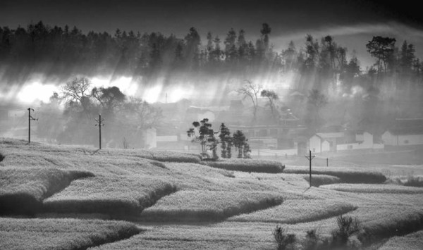 晨曦中的云南罗平油菜花田。目前,云南省罗平县的数十万亩油菜花正迎春开放,山岭、村舍、道路、河流皆融入油菜花海,景色迷人。 (新华社发)