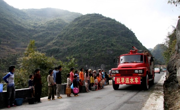 2月1日,广西大化瑶族自治县组织抗旱送水车为七百弄乡弄鲁屯群众送水。2009年8月以来,广西壮族自治区遭遇秋冬连旱,据自治区防汛抗旱指挥部新近统计,目前大约还有24万多人、11万头大牲畜面临饮水困难。目前,广西各地政府已派出大批干部下乡,及时为旱区群众提供应急供水。 (新华社发)