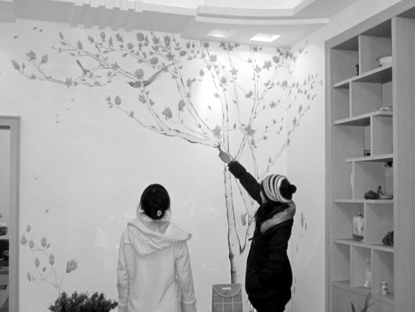她们开始了市场调查,几乎寻访了随州所有的房屋装饰公司,发现现有的墙面装饰方式,无外乎墙纸和液体壁纸,而墙纸不够环保,保持时间不够持久,易受潮;液体壁纸花色单一,模式化,缺乏灵气。而手绘墙画,可以根据不同的家居环境,进行设计搭配,画师通过现场勾勒和调色,最终完成的作品,更能彰显主人的欣赏品位和情感表达,更能营造一种文化氛围和与众不同的个性空间。