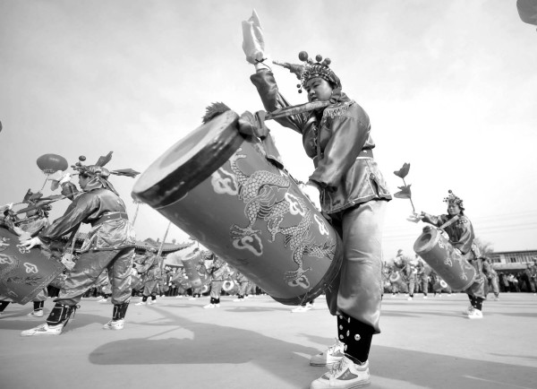 2月3日,甘肃省榆中县金崖镇农民太平鼓队在榆中县来紫堡乡黄家庄村表演。春节临近,榆中县几支由农民组成的太平鼓队开始活跃在当地乡村,利用农闲时间为农民表演他们自己编排的节目。 (新华社发)