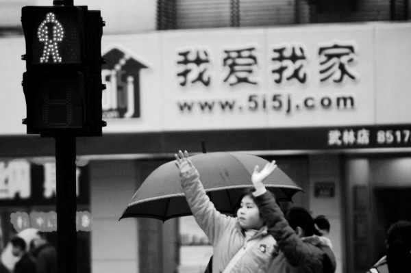 2月5日,两位杭州市民在“我爱我家”某门店门口。日前,杭州市二手房成交量最大的中介公司“我爱我家”因违规操作经济适用房出租业务,被杭州市房管局勒令停业整顿。 (新华社发)