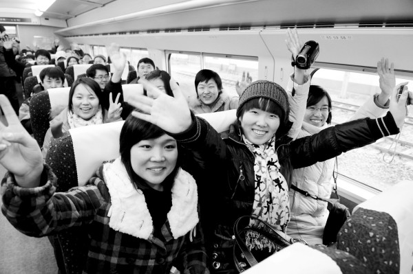 旅客在郑州开往西安G2003次“和谐号”动车组列车上向记者招手致意。