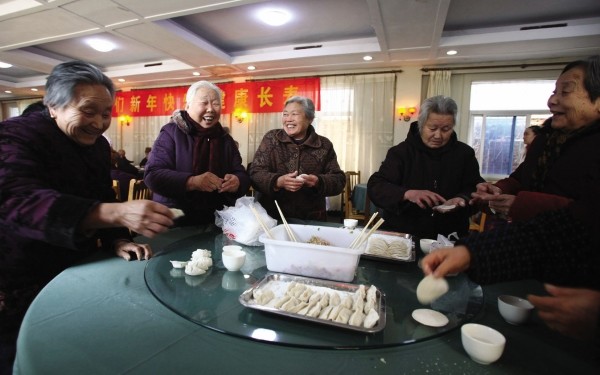 随州市第一社会福利院的老人们日前正欢欢喜喜地包着饺子,准备过年。老人们说,现在党的政策好,他们住在福利院里非常幸福。 (本报记者 孙洪涛摄)
