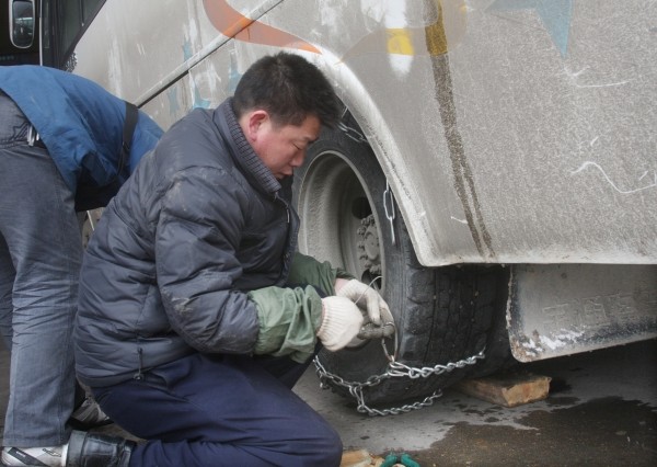 2月11日,记者在随州客运站看到,受降雪天气影响,一些客运车辆装上了防滑链,确保滞留车站内的旅客安全回家。 (本报记者 杨闻名摄)