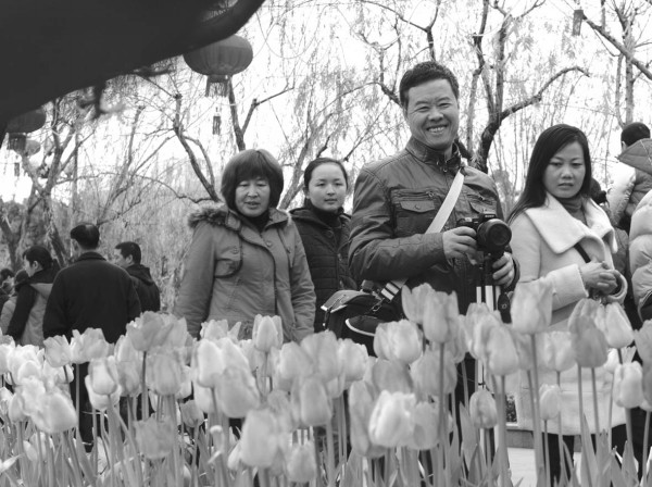 ·游人春节期间在福州公园观赏郁金香