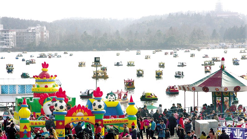 正月初五,城区白云湖游船如织,欢声笑语。(本报记者 杨闻名 摄)