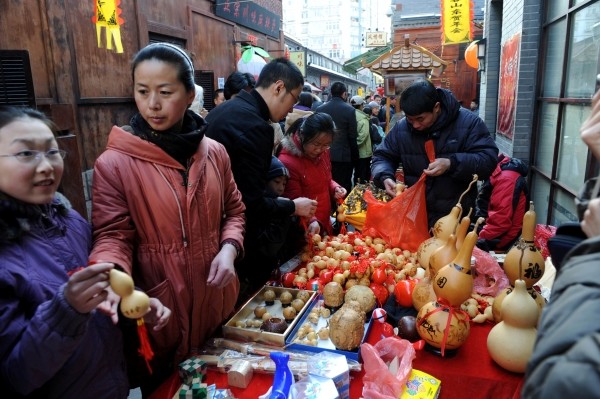 2月18日,游客在青岛百年老街劈材院购买纪念品。春节期间,为了让旅游内容丰富多样,山东省旅游部门推出了“好客山东贺年会”系列产品。 (新华社发)