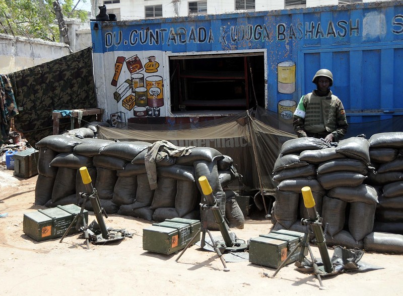 2月19日,记者跟随非盟驻索马里特派团装甲巡逻车在摩加迪沙市区巡逻时,听到街头枪炮声频现,且多出现在特派团营地附近。据特派团官员介绍,目前当地反政府武装多采用远距离操控方式袭击,袭击目标主要是政府机构、特派团巡逻队,但有时索马里民众也会无辜遭殃。图为一个非盟驻索马里特派团控制点的迫击炮。 (新华社发)
