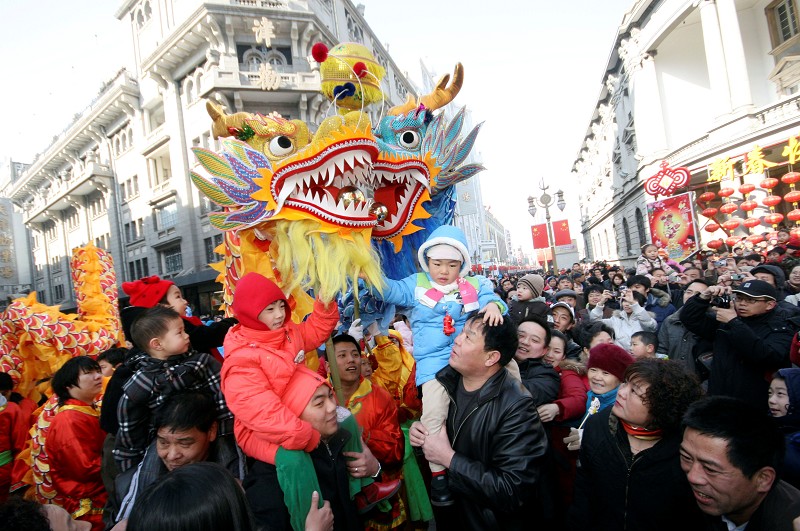 2010年春节黄金周期间,全国消费品市场繁荣兴旺。2月13日至19日,全国实现消费品零售额3400亿元,比去年春节黄金周增长17.2%。另据初步统计,各地假日旅游接待总量较去年同期保持增长,国内旅游总花 费 同 比 增 长23.1%。图为天津市商家汇聚的金街举办的文娱民俗新春花会踩街活动上,孩子们与进行表演的 “大龙”亲密接触。 (新华社发)