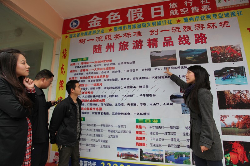 针对节后旅游淡节,我市首家省级文明旅行社——随州金色假日旅行社,向全国推出玉龙温泉、炎帝神农故里等精品旅游线路,全面推介随州,收到理想效果。目前已与武汉大学旅行社等十余单位签订意向合同。 (本报记者 白 丁摄)