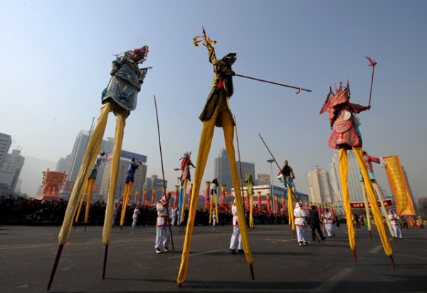 2月26日,演员在社火展演活动中进行永登苦水高高跷表演。当天是农历正月十三,甘肃省兰州市举行千人社火展演活动,兰州太平鼓、永登苦水高高跷等一批非物质文化遗产“绝活”集体亮相。 (新华社发)