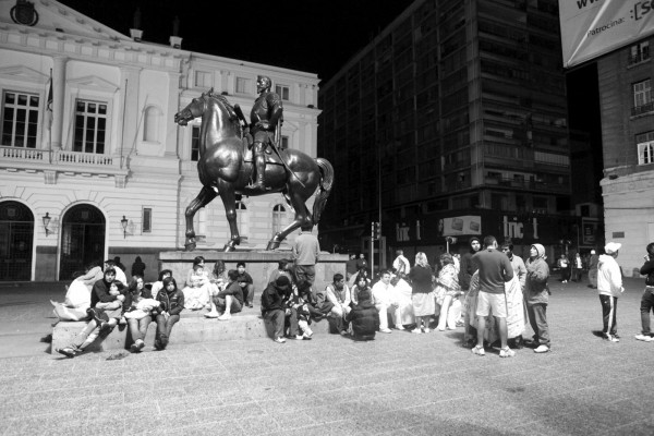 当地时间2月27日凌晨,在智利首都圣地亚哥,人们聚集在市中心一处广场躲避地震。当日,智利发生8·8级强震。 (新华社发)