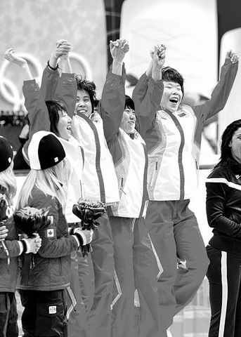 ←从左至右为孙琳琳、王濛、张会、周洋惊讶的韩国教练(左)与兴奋的中国教练→