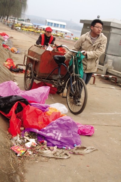 3月1日清晨,市环卫处工人在城区白云湖东大堤清扫元宵夜燃放烟花、爆竹后遗留的废物。据环卫部门介绍,当日城区的鞭炮垃圾有10多吨,昨日400多名环卫工人出动清扫。