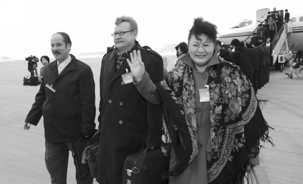 带着广大群众的心声和希望,出席全国政协十一届三次会议的政协委员1日陆续抵京,他们将在即将召开的盛会上履行政治协商、民主监督、参政议政的职责。图为新疆维吾尔自治区政协委员抵达北京。(新华社发)