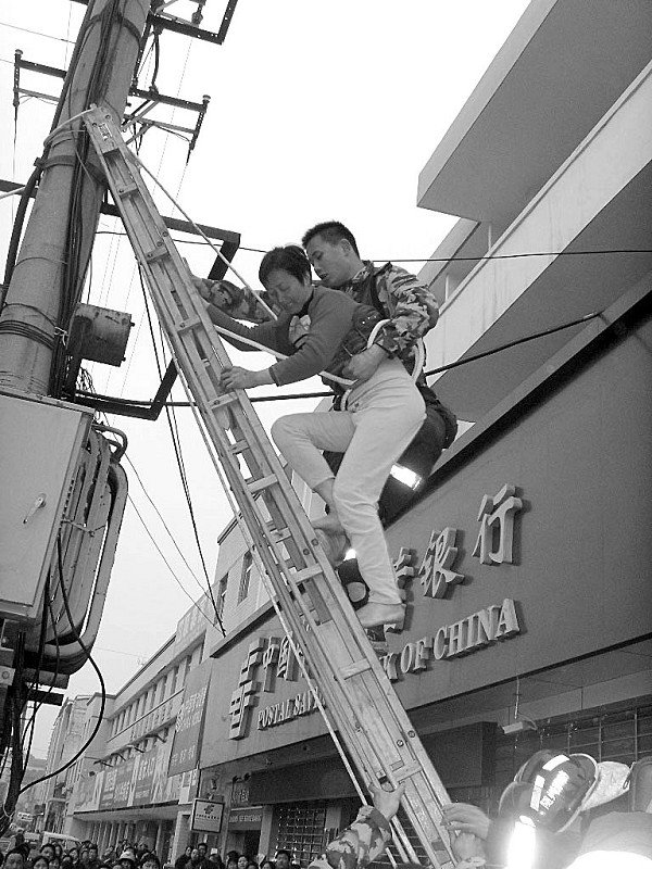 近日,随县均川镇一女精神病患者从变压器沿高压电杆向上攀爬。为防止触电事件发生,均川供电所向上请示后,对“均59线”实施紧急停电。同时,消防官兵架梯而上,与均川派出所干警一起将该妇女救下。救援完毕后,恢复供电。图为施救现场。(通讯员 任尚海 本报记者 杨闻名 摄)