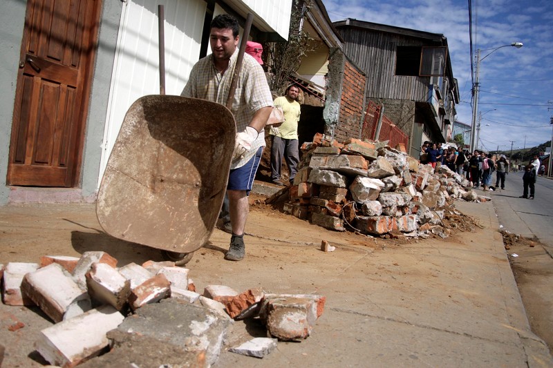 3月5日,智利重灾区塔尔卡瓦诺一名居民在房屋前清理地震留下的碎石。目前,智利地震灾区民众的生活渐趋平静。 (新华社发)