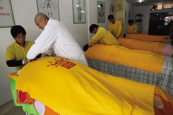 爽生堂按摩店在“三八”妇女节到来之际,免费为妇女按摩、火灸疗颈椎病、失眠等疾病,支出人工、药品等费用近千元,受到社会好评。(本报记者 白丁 摄)