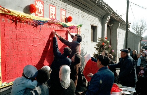 ·1987年4月,北京朝阳门街道大方家胡同选区的工作人员在贴选民榜。