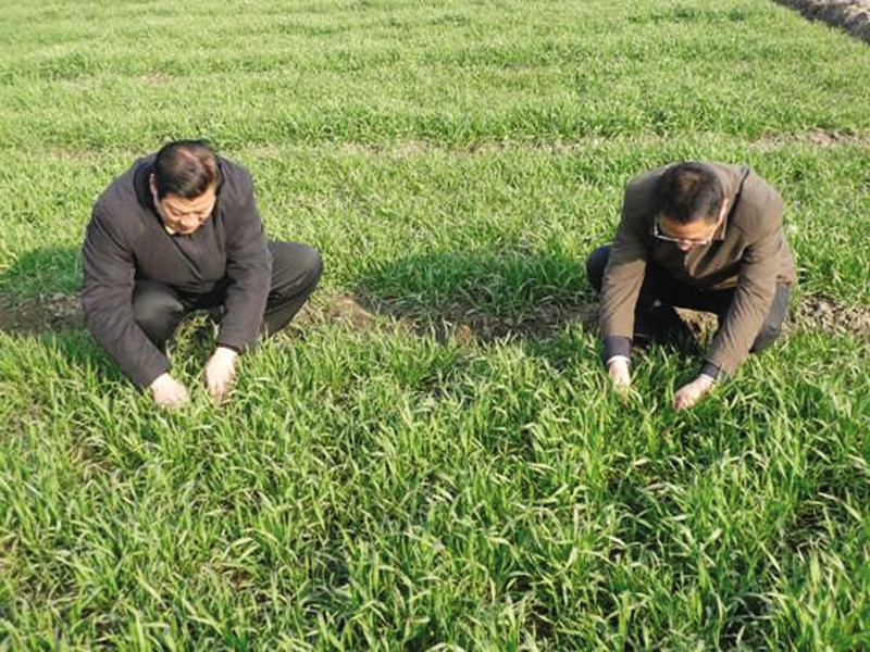 针对今年后春节期间雨雪冰冻和近日气温迅速上升、小麦生长转旺的情况,市农业科学研究所的技术人员深入到田间地头,调查小麦苗情,指导农民科学田管。图为市农科所高级农艺师黄成顺(左)在新街小麦良种繁育基地察看小麦长势。(王峰)
