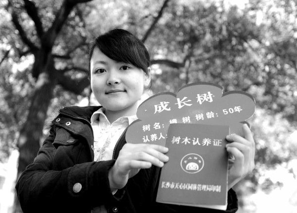 3月11日,黄钰熙女士展示她所在单位——长沙市第四制水有限公司认养樟树的认养证和认养牌。