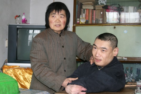 3月10日,在原铁路中学家属住宅区的孙桂芳家中,71岁的老人正用她柔情的双手为坐在特制木架椅上的儿子徐浩波按摩。因为长期的劳神操心,她坚毅的神情中流露出几丝疲惫与无奈。