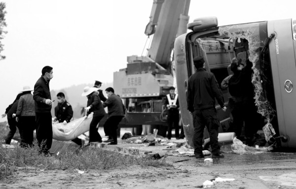3月13日下午1时30分,一辆从江西省开往深圳市的江西籍大客车行驶至广东省惠州市惠城区金龙大道时失控侧翻,造成14人死亡,9人受伤 (其中两人重伤),伤员已全部及时送往医院抢救。图为工作人员在清理惠州车祸现场。