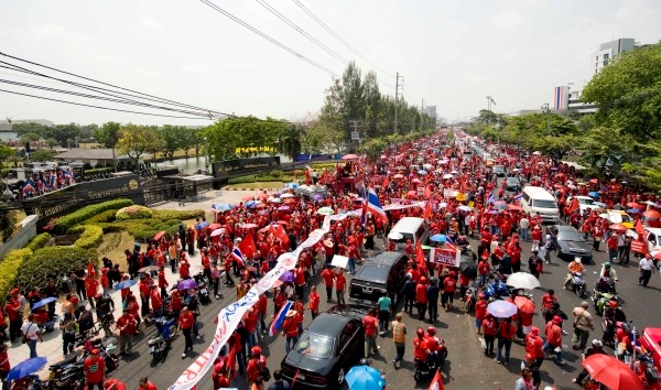 阿披实宣布拒绝解散国会下议院后,“红衫军”领导人永·多集拉干说,“红衫军”不会像2008年泰国人民民主联盟支持者“黄衫军”那样,为向政府施压而封锁曼谷国际机场。但另一名“红衫军”领导人纳塔武则表示,将抽取100万毫升“红衫军”集会者的鲜血,在16日泼洒在总理府四周,以此向政府施压。