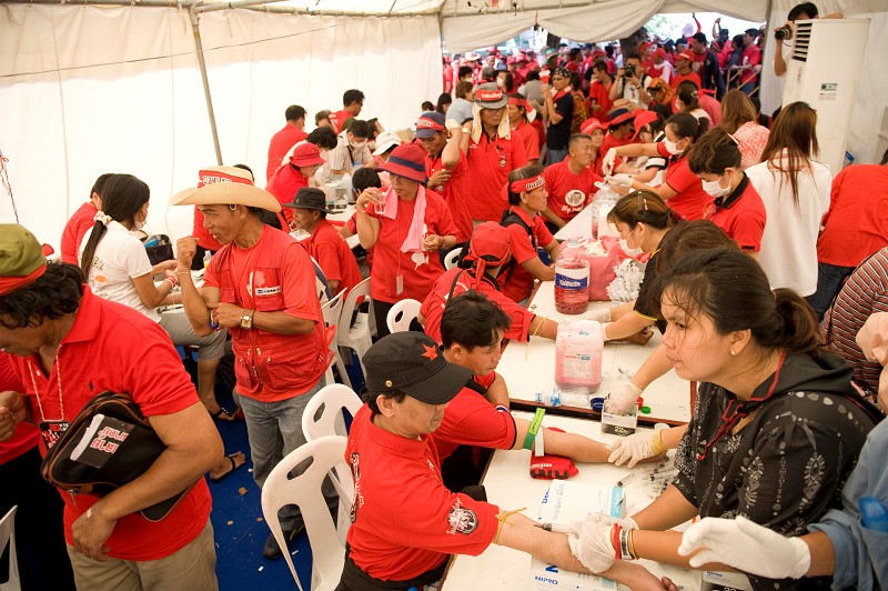 “红衫军”集会示威者当天早晨发起抽血行动,每名献血者被抽取了10毫升血液。约40名属于反对党为泰党的国会下议院议员也参加了献血。从12日开始,来自泰国全国各地的“红衫军”搭乘各种车辆陆续进入曼谷,参加大规模反政府集会活动。