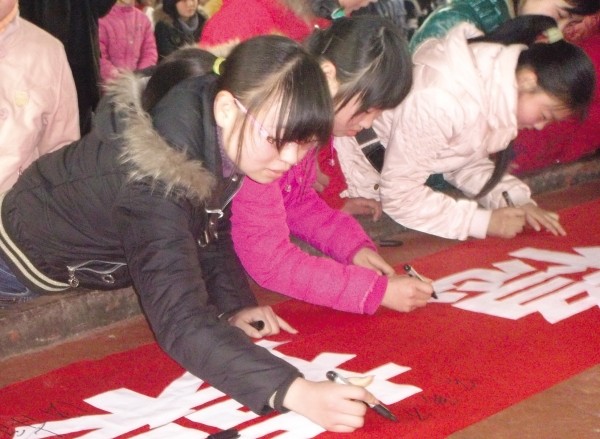 近日,大洪山风景名胜区长岗中心学校对学生进行爱国理想教育,以爱祖国爱家乡的感情,激发学生发奋图强,勇攀学习高峰。图为该校学生进行“立志成才,报效祖国”的宣誓及签名活动。(本报记者 张顺 通讯员 孛涛 摄)
