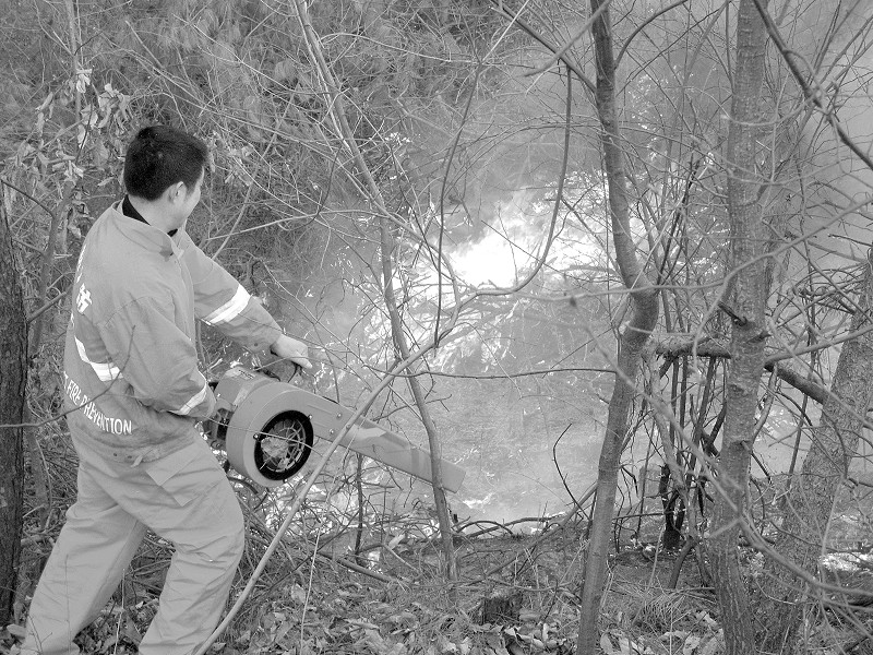 三月十七日下午,城南新区陨水村境内发生森林火灾,市消防大队和市、区森林消防大队迅速采取水枪喷射和风力灭火机相结合方式,奋战近二个小时,将大火扑灭。(王华江 摄)
