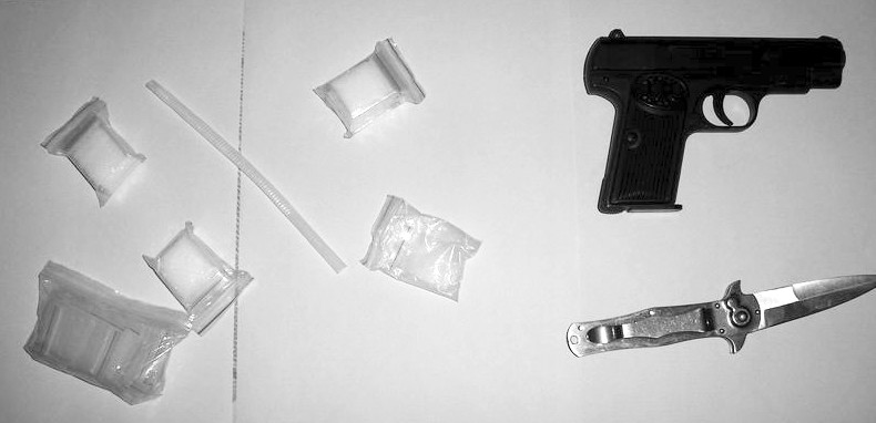 民警迅速对该男子控制,同时将欲逃的女子抓获。民警依法对该车进行了进一步的检查,当场从该车后备箱中搜出管制刀具六把、随州籍车辆号牌一副,在车座位夹缝中搜出30余包K粉、仿真手枪和匕首各一把。(如图)
