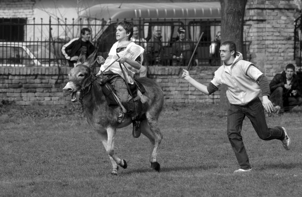 3月20日,人们在塞尔维亚首都贝尔格莱德西北30公里的一个村庄参加传统的赛驴活动。 (新华社发)
