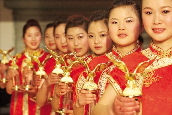 手托金灿灿的奖杯,礼仪小姐们整装待发
