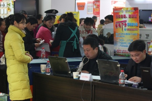 近日,市商务局、财政局和购物中心联合推出家电下乡现场补贴活动。当天现场进行商家信息录入、财政部门审核、补贴300余户,补贴兑付达10余万元。 (本报记者 杨闻名 通讯员 李海波摄)