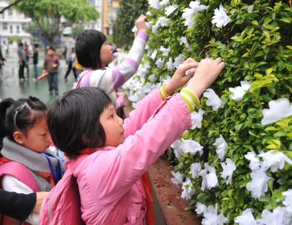 图为:3月24日,福建省南平市实验小学的学生在校园内的绿篱上系上小白花,以寄托对8名遇害同学的哀思。 (新华社发)