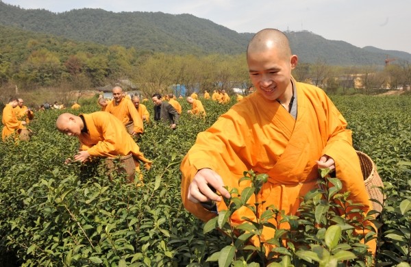 3月25日,一位僧人在茶园里采摘禅茶。当日,杭州法净禅寺按照佛教仪轨举行禅茶开摘前的洒净仪式,100多位僧人随后背起茶篓开始收获寺院种植的 “法净禅茶”。 (新华社发)