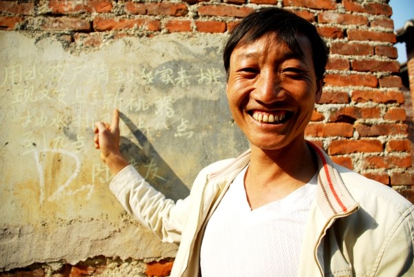 ◆陆建友在村中写了多处取水告示“用水农户请到我家来挑,现又安上了新机器,抽水时间早上8点到9点。” (新华社发)