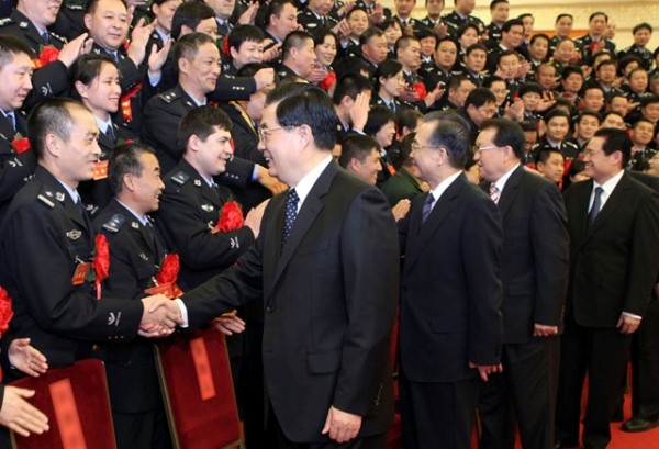 3月26日,全国公安机关爱民模范先进事迹报告会在北京人民大会堂举行。会前,党和国家领导人胡锦涛、温家宝、李长春、周永康等亲切会见爱民模范。(新华社发)