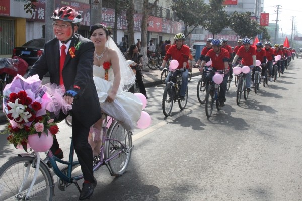 昨日,随城街头百余名自行车骑行爱好者组成迎亲队伍,别样的婚礼吸引众多路人的目光。新郎胡定峰和新娘王云云的婚车不是奔驰宝马,而是一辆自行车