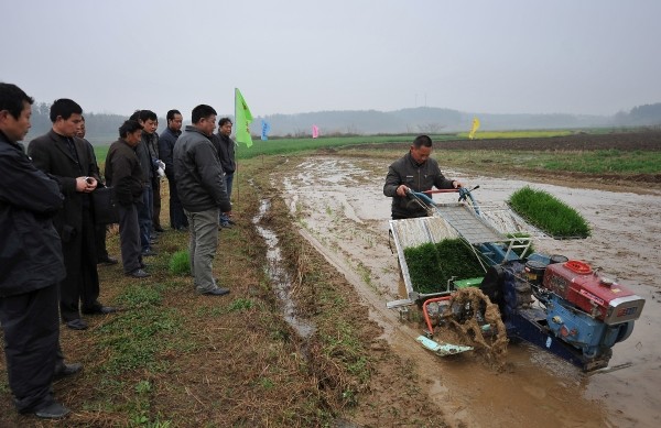 3月24日,一种安装在手扶拖拉机上的小型插秧机在曾都区何店镇谌家岭村的水田里大显身手。