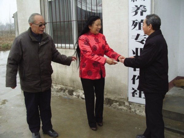 三月二十四日,市老促会会长吴治炎(右一),广水市老促会会长李以超(左一)将一万元资金送到全国闻名的广水市单亲母亲、养猪场场长刘家翠(中)手里,鼓励她再扶持二十位老区单亲母亲养猪脱贫致富。(石守京 袁昌斌 摄)