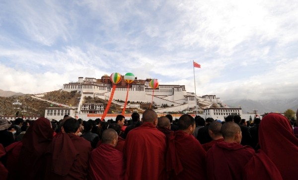 3月28日,人们在布达拉宫广场参加升国旗、唱国歌仪式。当日,拉萨各族各界3000多人聚集在布达拉宫广场,升国旗、唱国歌,庆祝第二个“西藏百万农奴解放纪念日”暨西藏百万农奴解放51周年。 (新华社发)