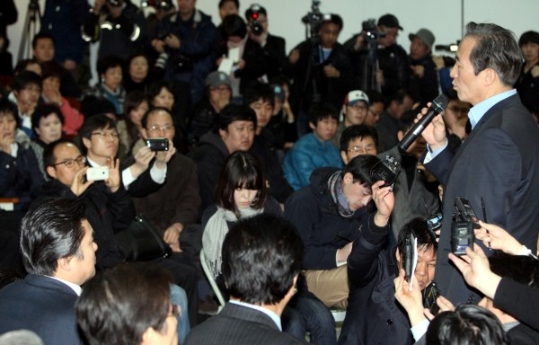 3月28日,在韩国平泽,韩国大国家党党首郑梦准(右)和失踪者家属见面。3月26日晚沉没的韩国海军“天安”号警戒舰事故原因仍在调查中。 (新华社发)
