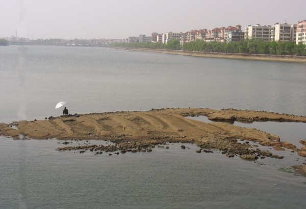 由于氵厥水河西大堤整修扩坡,连日来,白云湖水位下降,部分滩涂显露出来,许多市民在新露出的沙滩上散步或垂钓。 (本报记者 杨闻名摄)