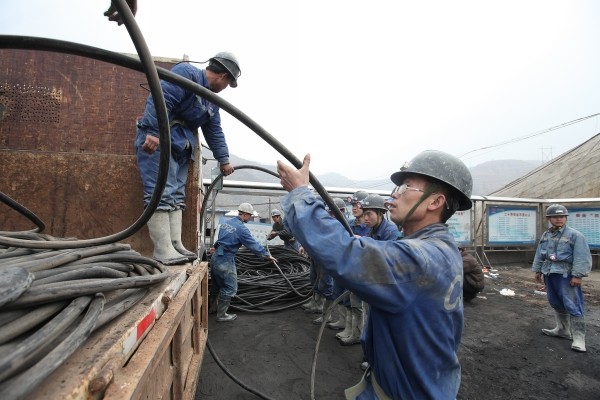 3月29日,救援人员在转运救援设备。3月28日13时40分左右,由中煤一建公司63工程处承建的王家岭煤矿发生透水。据初步核实,当班下井261人,其中升井108人,153人被困井下,生死不明。目前事故抢险救援工作紧张进行。抢险指挥部人员介绍,2000米长的6吋水管已经被送进场,8台每小时排水125立方米的水泵也已运到了现场,仍有大量排水设备从霍州、朔州紧急调运而来…… (新华社发)