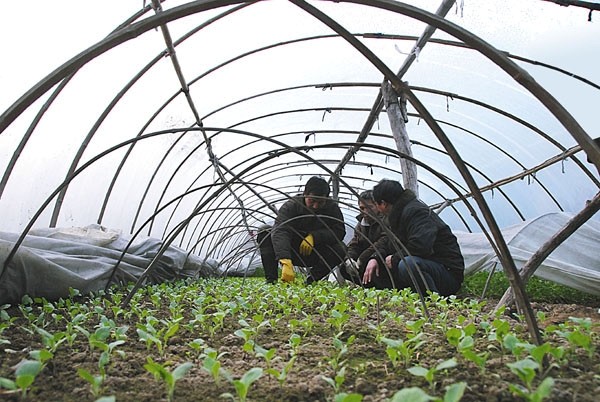 连日来,曾都经济开发区首义村村民们看好市场蔬菜价格,积极利用近郊优势和晴好天气,纷纷抢抓农时扩大蔬菜种植面积。开春以来,该村已扩大蔬菜种植面积10余亩,种植小白菜、蒜苗、黄瓜等20多个品种。蔬菜长势喜人。图为村民们在大棚里侍弄菜苗的情景。 (本报记者 唐天才 通讯员 李一勤摄)